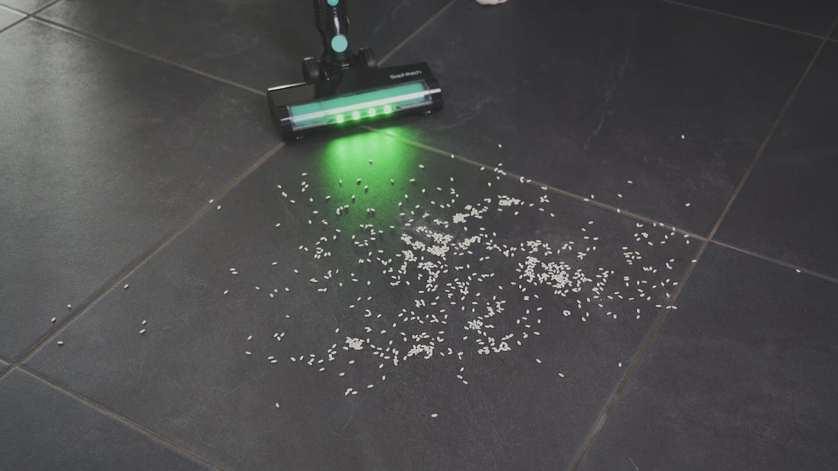 In één vloeiende beweging verwijdert hij vuil, vlekken en bacteriën op tegels, laminaat en tapijt.